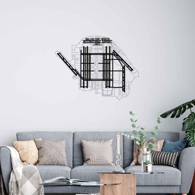 Dallas Fort Worth International Airport Metal Wall Art is our multilayer and multicolor 3-piece wall art. It includes the landing strips in our classic black finish and the surrounding area in a shiny and sparkly gray color. To top it off, we attach a metal plate, with the airport's name, and the construction date. This masterpiece alone or in combination with any of our other products will give your office, room, or garage a unique look that will catch the attention of any aviation enthusiast and will add a subtle touch of aviation spirit to your home's interior design.