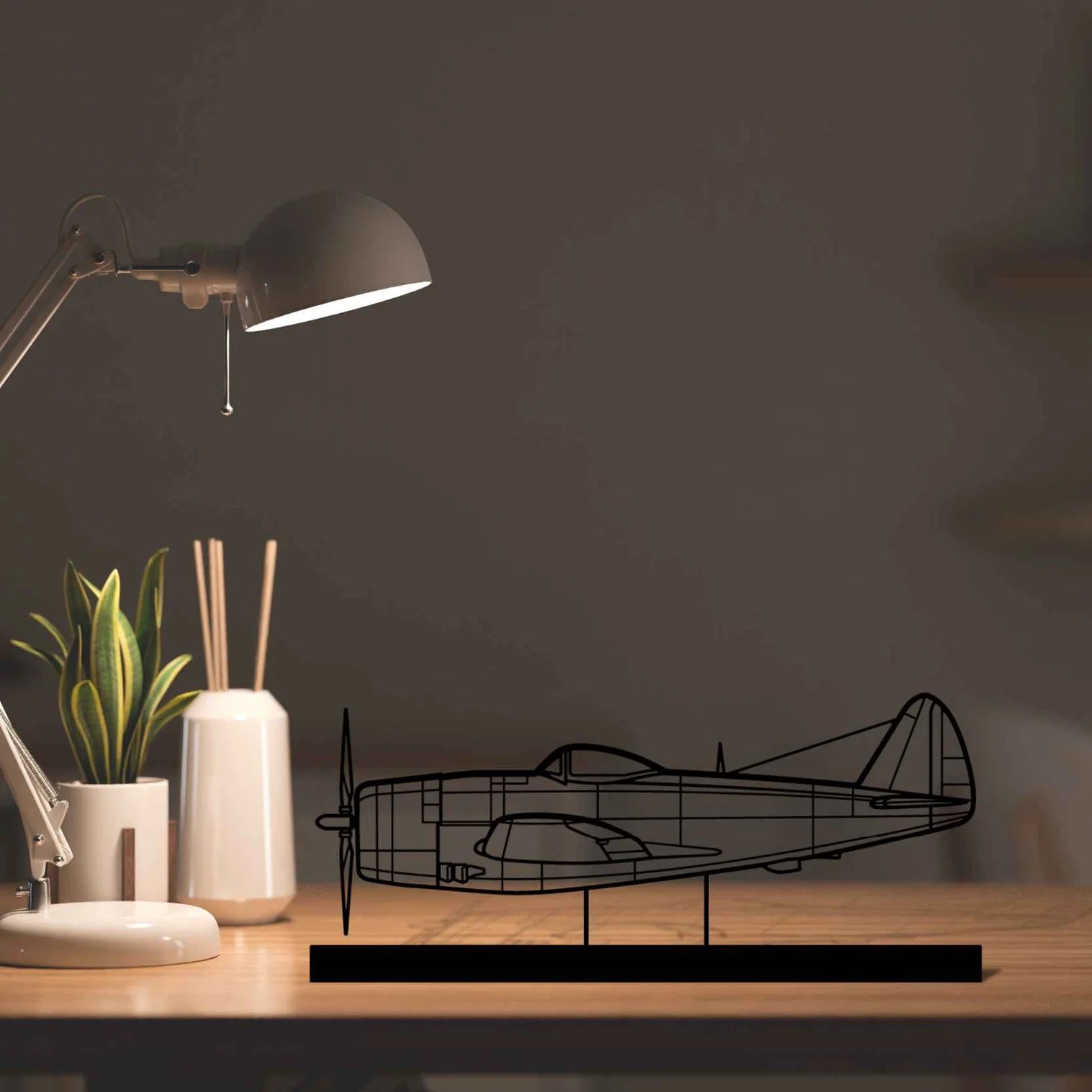 P-47D Silhouette Metal Art Stand will give your hangar, office or room a unique look that will catch the attention of any aviation enthusiast and will add a subtle touch to your interior design.